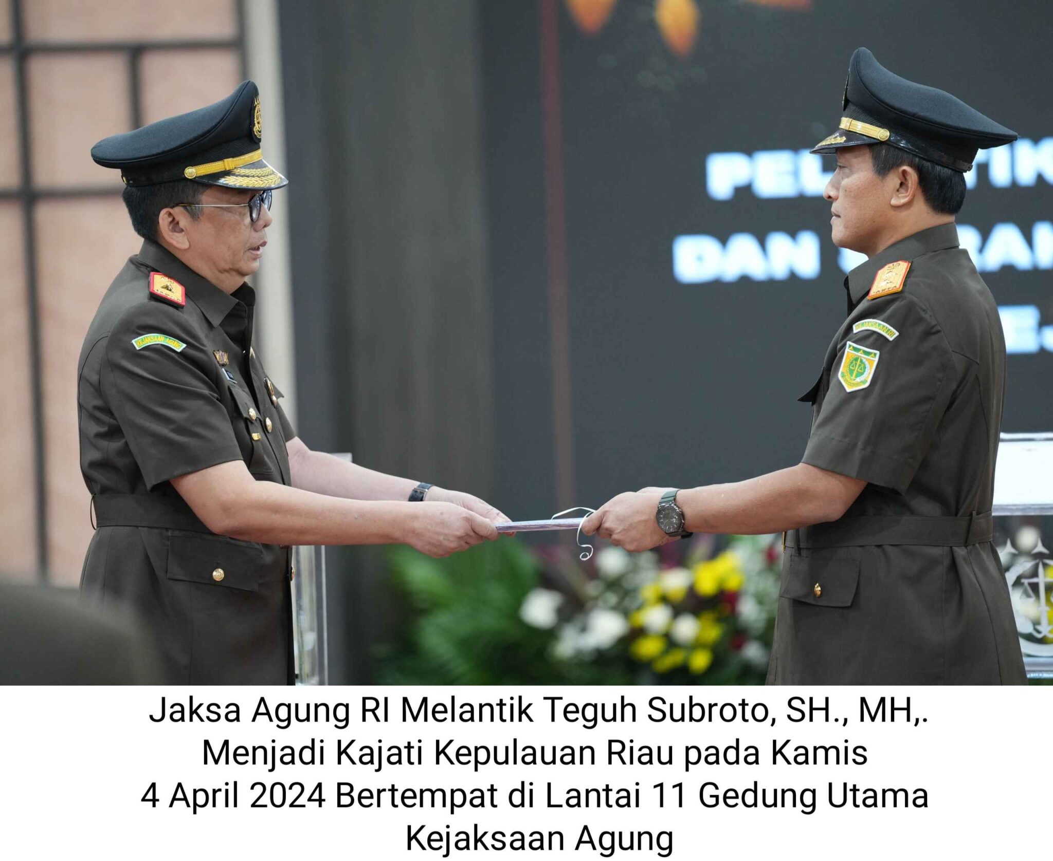 Dalam rangka meningkatkan kinerja organisasi melalui upaya peningkatan sinergi, kolaborasi untuk membangun spirit Kejaksaan Agung Republik Indonesia guna menciptakan Penegakkan Hukum yang Humanis “Tajam Keatas, Humanis Kebawah”. Jaksa Agung RI pada Kamis 4 April 2024 bertempat di Lantai 11 Gedung Utama Kejaksaan Agung, melantik, mengambil sumpah, dan menyaksikan serah terima jabatan Kepala Kejaksaan Tinggi dan Pejabat Eselon II di lingkungan Kejaksaan Agung yang salah satunya Kepala Kejaksaan Tinggi Kepulauan Riau Teguh Subroto, SH., MH. Pelantikan dan Pengambilan Sumpah Jabatan tersebut berdasarkan Surat Keputusan Jaksa Agung RI Nomor 86 Tahun 2024 tanggal 18 Maret 2024 tentang Pemberhentian dan Pengangkatan Dari dan Dalam Jabatan Struktural Pegawai Negeri Sipil Kejaksaan Republik Indonesia.